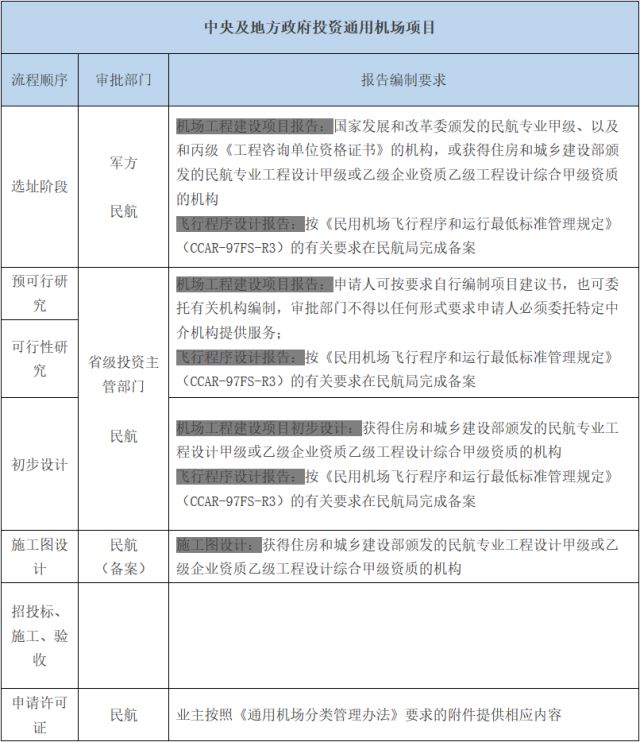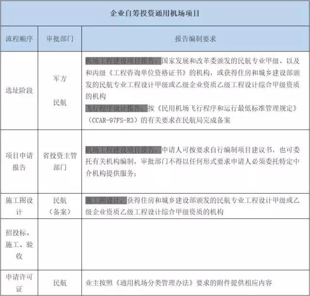 根據(jù)《政府核準(zhǔn)的投資項(xiàng)目目錄》(2016年),新建運(yùn)輸機(jī)場(chǎng)項(xiàng)目由國(guó)務(wù)院、中央軍委核準(zhǔn),新建通用機(jī)場(chǎng)項(xiàng)目、擴(kuò)建軍民合用機(jī)場(chǎng)(增建跑道除外)項(xiàng)目由省級(jí)政府核準(zhǔn)。