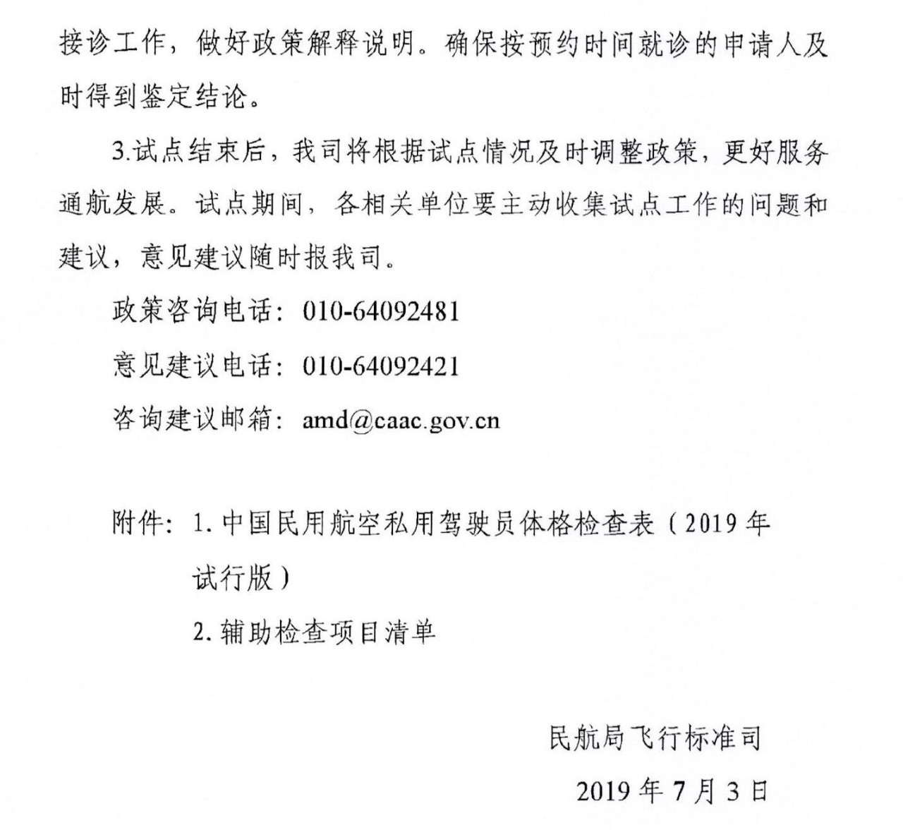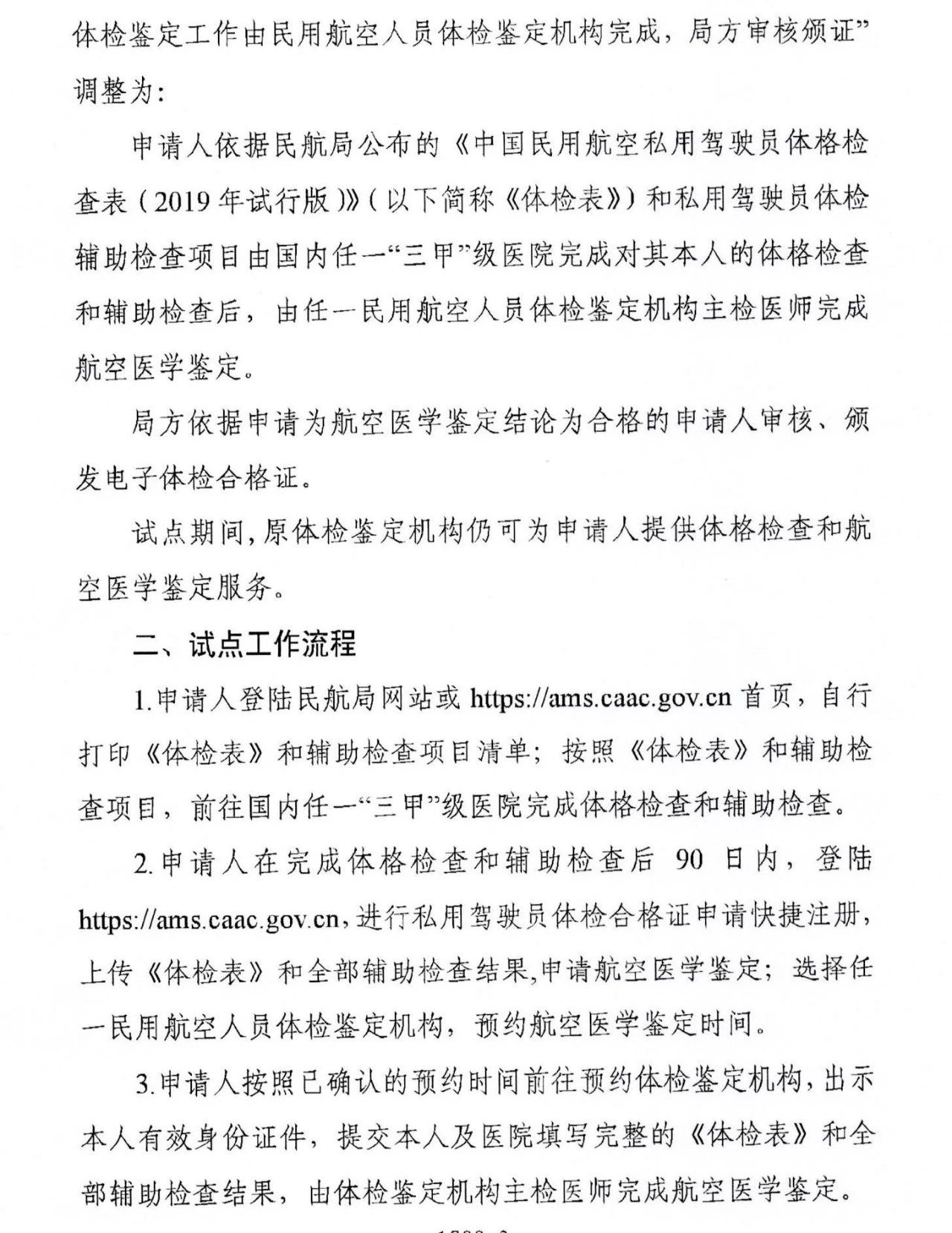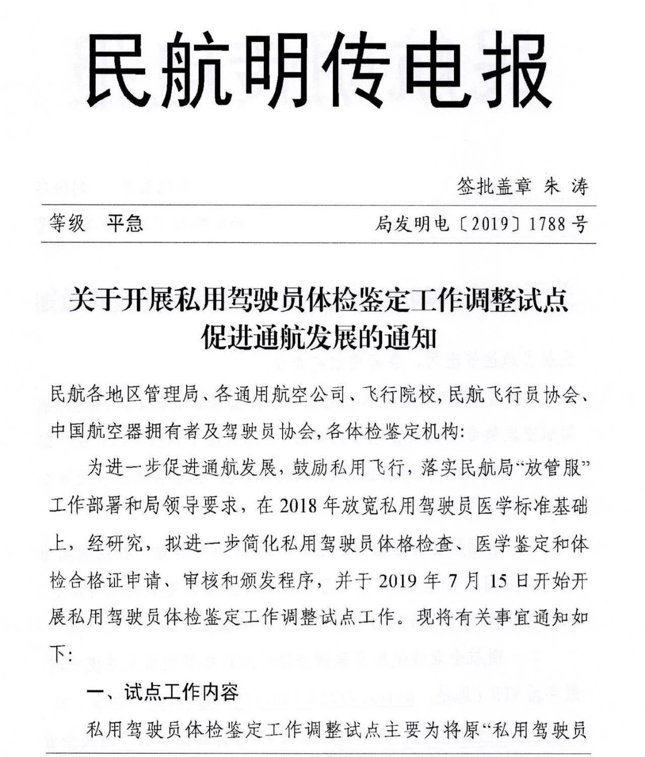 為進(jìn)一步促進(jìn)通航發(fā)展、鼓勵(lì)私用飛行,民航局?jǐn)M進(jìn)一步簡化私用駕駛員體格檢查、醫(yī)學(xué)鑒定和體檢合格證申請、審核和頒發(fā)流程并下發(fā)了《關(guān)于開展私用駕駛員體檢鑒定工作調(diào)整試點(diǎn) 促進(jìn)通航發(fā)展的通知》,具體內(nèi)容如下: