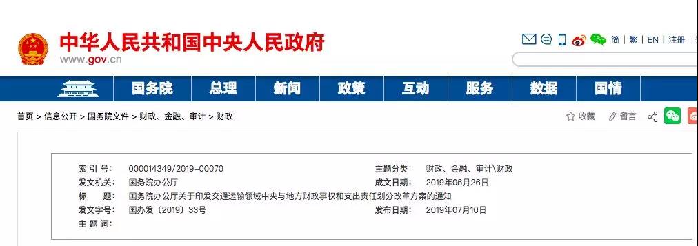 近日,國務(wù)院辦公廳印發(fā)《交通運輸領(lǐng)域中央與地方財政事權(quán)和支出責(zé)任劃分改革方案》(以下簡稱《方案》),自2020年1月1日起實施。